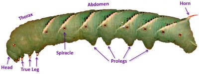 Manduca, along with the beetles, ants, bees, wasps, and flies, display the form of development seen in many insect species, a complete metamorphic change. The adult looks much different than the larva and pupa. “Holometabolous” insects like Manduca start life as an egg, then emerge from the egg to feed and grow as a larva. The insect then metamorphoses into a pupa and undergoes extensive reorganization of the body plan to emerge as an adult.